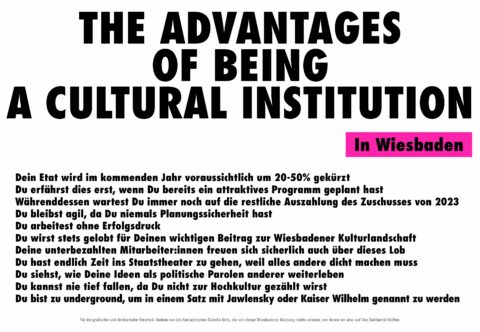 »Hülle ohne Fülle« – Häuser ohne Programm – wer kann das für die Zukunft Wiesbadens wollen? Wir stärken durch Attraktivität und Umwegrentabilität die heimische Wirtschaft, wir tragen zum sozialen Zusammenhalt bei, wir geben Bürger:innen eine öffentliche Stimme, wir generieren Ideen für die Zukunft der Stadtentwicklung, wir sind ein tragender Teil der aktiven Zivilgesellschaft und stärken damit das demokratisch-geistige Klima der Stadt.