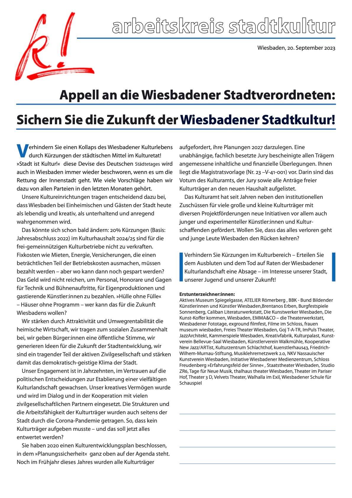 Das Kulturamt habe seit Jahren neben den institutionellen Zuschüssen für große und kleine Kulturträger mit diversen Projektförderungen neue Initiativen vor allem auch junger und experimenteller Künstler:innen und Kulturschaffenden gefördert. „Wollen Sie, dass das alles verloren geht und junge Leute Wiesbaden den Rücken kehren?“, werden die Stadtverordneten gefragt und gleichzeitig aufgefordert: „Verhindern Sie Kürzungen im Kulturbereich – Erteilen Sie dem Ausbluten und dem Tod auf Raten der Wiesbadener Kulturlandschaft eine Absage – im Interesse unserer Stadt, unserer Jugend und unserer Zukunft!“