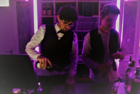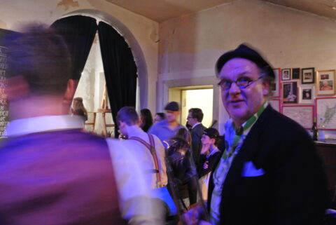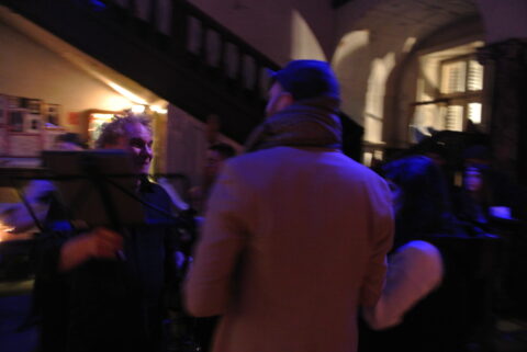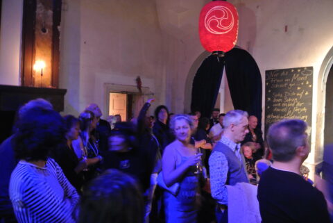 Schon bald nach Öffnung musste das Schloss Freudenberg schließen. Wegen Überfüllung. Zur Besänftigung und Ablenkung der (noch) nicht Reingekommenen begaben sich einige der in verschiedenen Formationen aufspielenden sehr vielen Musiker:innen dieses Abends hinaus zu den Wartenden, spielten inmitten der Menschen auf und machten die Außentreppe zur Tanzfläche. Derweil spielten drinnen andere Musiker:innen, während in Sachen Getränke erstmal nicht viel mehr ging als Anstehen und Warten. Ein Warten, dass sich lohnte, denn es wurde Exquisites ausgeschenkt am Tresen, was die ohnehin fiebrige Stimmung im diversen Räumen und Gängen des Schlosses noch weiter befeuerte.