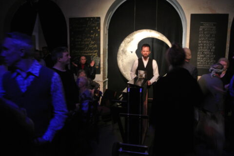 Es wurde getanzt, es wurde geredet, es wurde getrunken, es wurde geschaut und sich gelümmelt, auf Sofas und im Schoss der Frau Mond, und auch hier und da geknutscht, ganz wie es sich Gastgeberin Katharina Schenk gewünscht hatte. Sie hatte die Tanzbar Freudenberg-Idee ausgeheckt gemeinsam mit Roland Vanecek aka Susa Phon Schneckenhausen, diesem sympathisch wahnsinnigen und wahnsinnig guten Musiker des Hessischen Staatsorchesters, der auch jenseits des Orchestergrabens an allen möglichen und unmöglichen Orten und in allen möglichen und unmöglichen Formationen aufspielt.