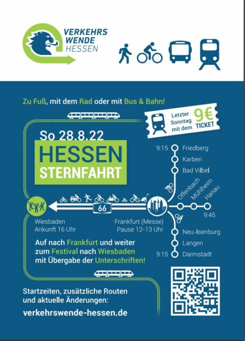 „Ziel des Verkehrswende-Marktes ist es, den Diskurs in der Stadt Wiesbaden zum Thema Mobilität voranzubringen und Bürger:innen und Besucher:innen für dieses enorm wichtige Thema zu sensibilisieren“, erklären die Initiatoren. Um 15 Uhr dreht sich eine Podiumsdiskussion um die Frage „Was bremst die Verkehrswende?“. Diskutieren werden der Hessische Verkehrsminister Tarek Al-Wazir, Prof. Monheim (u.a. Gründungsmitglied von ADFC und VCD), Prof. Lanzendorf (Mobilitätsforscher Uni Frankfurt) sowie Kerstin Haarmann (Bundesvorsitzende VCD). Ab 16 Uhr werden die Sternfahrt-Teilnehmer:innen erwartet, die gesammelten Unterschriften des Volksbegehrens Verkehrswende werden stellvertretend für die Landesregierung an den hessischen Wirtschafts- und Verkehrsminister Tarek Al-Wazir übergeben.