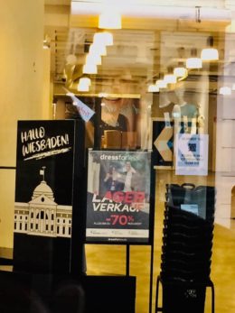 Die Zukunft des Areals ist ungewiss, die Zwischennutzung ist nun geklärt. Mit „Dress for less“ sagt erneut ein Mode-Outlet „Hallo Wiesbaden“ und verspricht in bereits sichtbaren Werbeplakaten „Lagerverkauf“ mit bis zu 70% Rabatt. Die ersten Kleiderständer stehen schon in den weitläufigen Räumen, auch Ware ist schon zu sehen. „dress for less“ ist nach Angaben der Eigentümer das „führende Online-