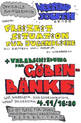 Am 4. November um 16.20 Uhr beginnt die offizielle „Westend Youth“-Kundgebung zur „Freizeitsituation für Jugendliche in Zeiten von Corona“. In der Ankündigung heißt es: „Es ist Platz für jeden kreativen/konstruktiven Redebeitrag.“