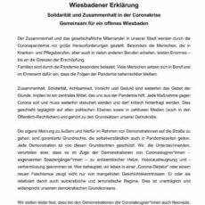 Mehr als 60 Wiesbadener Persönlichkeiten haben die Erklärung „Solidarität und Zusammenhalt in der Coronakrise – Gemeinsam für ein offenes Wiesbaden“ – unterzeichnet. Um gemeinsam ein Zeichen zu setzen, beteiligten sich Personen aus den Bereichen Politik, Sozialverbänden, Kultur, Gewerkschaften, Religionen, Schulen, Beratungszentren und Wirtschaft an der vom Wiesbadener Bündnis für Demokratie initiierten Aktion. Bis zum 18. […]