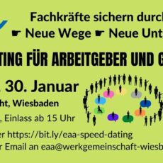 Die neu an den Start gegangene EAA Wiesbaden – Einheitliche Ansprechstellen für Arbeitgeber – veranstaltet am Montag, 30. Januar, erstmalig ein Speed-Dating für Arbeitgeber, Personalverantwortliche und Gründer, die Menschen mit Behinderungen einstellen, ausbilden oder weiterbeschäftigen wollen.