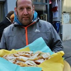 Interview und Foto: Maximilian Wegener. Wir sind hier in der neuen Fußgängerzone Wellritzstraße. Was haben Sie da auf dem Tablett? Das sind „Elefantenohren“. Eine ältere afghanische Dame aus dem Seniorenzentrum hier in der Straße hat gestern welche gemacht, und es waren viele übrig. Ich dachte, es wäre doch nett, die hier zu verteilen.