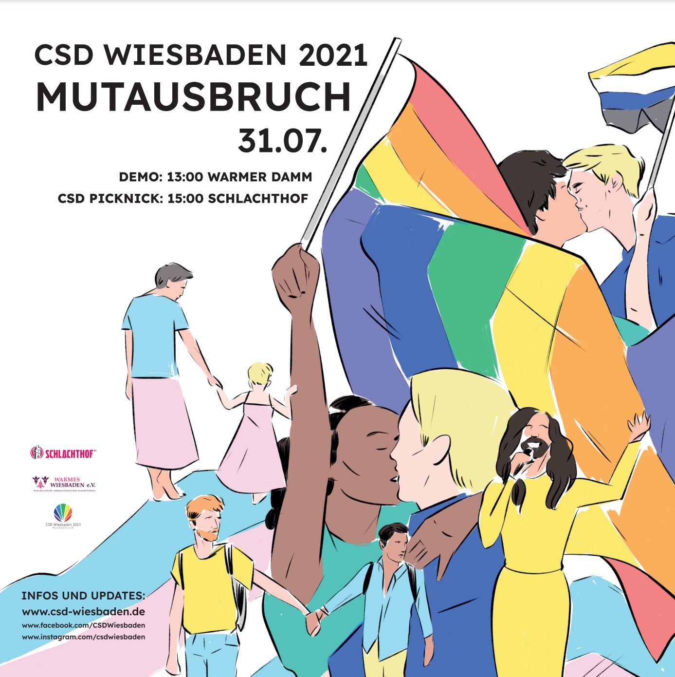 In der frischgebackenen „Rainbow City“ Wiesbaden findet am 31. Juli der Christopher Street Day mit Demo und (schon ausgebuchtem) CSD-Picknick statt. Das Motto des diesjährigen CSD – „Mutausbruch“ – kam aus der LGBT*IQ-Community und wurde vom CSD-Team ausgewählt. Das Motto soll vor allem verdeutlichen, dass es auch heute noch sehr viel Mut braucht, um als LSBT*IQ-Person zu seiner sexuellen oder geschlechtlichen Orientierung zu stehen. Pünktlich zum CSD wurde Wiesbaden als neuestes Mitglied im internationalen „Rainbow Cities Network“ aufgenommen.