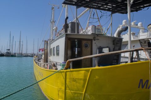 Juli 2023: Zwischen sorgfältig polierten Luxus-Yachten, braungebrannten Urlauber:innen und wehenden Palmen liegt im Hafen von Licata, an der Südküste Siziliens, ein gelb bemaltes Schiff. Es ist kein sauberes Gelb, unter dem Lack schimmert an einigen Stellen ein Grünstich hindurch. Ein paar Meter links, nicht weit vom Wasser, fährt ein Fahrradfahrer unbekümmert Schlangenlinien. Die kleine italienische Hafenstadt scheint zu erwachen, die Luft ist heiß und stickig. Der alte Fischkutter „Mare*Go” schaukelt ruhig im salzigen Wasser. Noch berührt die Holzplanke das Festland. Noch muss sich das 21 Meter lange Gefährt gedulden, bis es wieder Menschen retten kann. Denn die „Mare“, wie die Crew den Kutter liebevoll nennt, ist ein ziviles Seenotrettungsschiff.