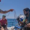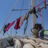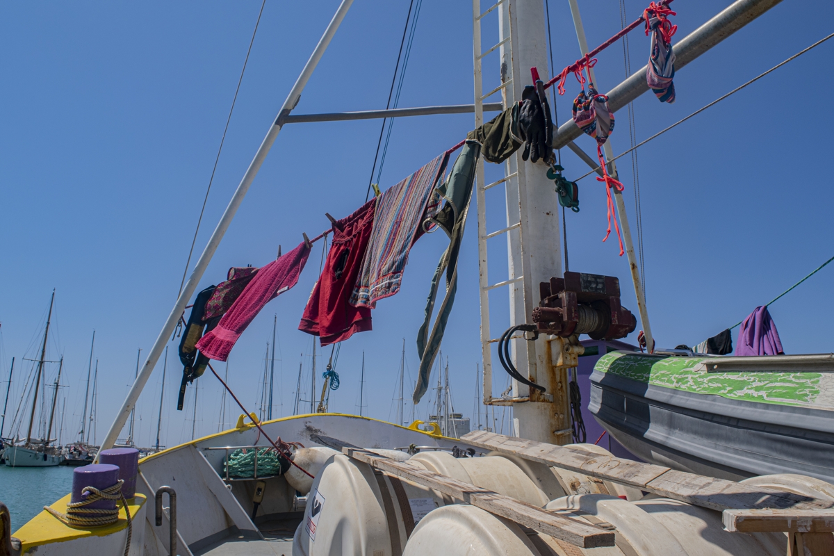 In der Küche der “Mare” duftet es nach Kartoffeln und angebratenen Zucchini. 80er-Jahre-Musik beschallt das untere Deck und ist bis in die Schlafkojen entlang des Ganges zu hören. Eine Etage oberhalb, die schmale Holztreppe hinauf, sitzt die Besatzung an Deck und isst zu Mittag. Die Stimmung ist ausgelassen, fast unbesorgt. In der Mitte des Kreises steht ein einziger Becher, randgefüllt. „Kollektiver Kaffee für alle.“ Crew-Mitglied Katharina schaut in die Runde. „Ist der Letzte.“ Sie schmunzelt. Marie sitzt neben ihr. Nur einer fehlt.