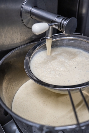Nach dem Reifeprozess lässt Santini das Vanilleeis durch einem Sieb laufen, um die Vanilleschoten-Stückchen zu entfernen. Anschließend geht es für die Creme auf dem schnellsten Wege in den Eisfroster. Aus dieser Menge werden später umgerechnet rund 400 der heißbegehrten Eiskugeln. Natürlich stellt Santini auch viele vegane Varianten her.