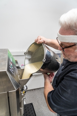 Allein die Kosten für die letztere Zutat sind immens: „Aktuell liegt der Preis für das Kilo zwischen 500 bis 700 Euro. Wir haben vor einigen Jahren aber auch schon über 1200 Euro gezahlt.“ Zunächst wird die Milch mit dem Vollei angerührt. „Nach der hochwertigen Biomilch habe ich lange gesucht, bis ich endlich im Allgäu fündig wurde.“ Anschließend fügt er Zucker und die Vanilleschoten hinzu. Danach wird die Masse über Nacht gekühlt.
