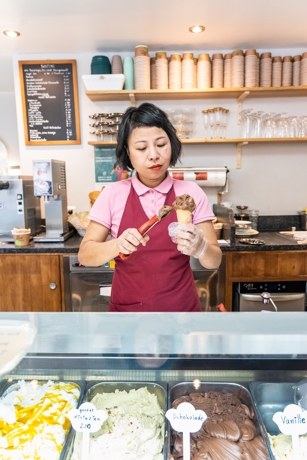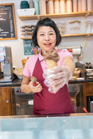„Was möchten Sie probieren?“, fragt mich Tai. Ich entscheide mich zunächst für gerösteten Sesam, weil ich die gräuliche Farbe so ungewöhnlich finde. Es schmeckt einfach köstlich. Sie reicht mir einen weiteren Löffel mit Orangensorbet. Dann noch einen namens „Kao Niew Ma Muang“. Das ist Kokoseis mit Mangosoße und gedämpften Klebereis. Und zum Abschluss: Schokoeis. Eine gewöhnliche Sorte, außergewöhnlich gut zubereitet. Was für ein genüsslicher Schulterblick an diesem vernieselten Tag.