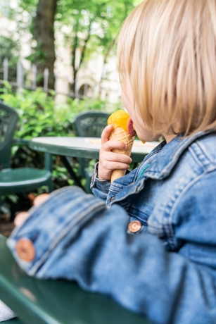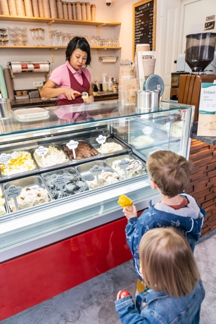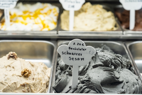 „Ich mag eigentlich alle Eissorten, bis auf die mit Zimtgeschmack. Das Gewürz schmeckt meiner Meinung nach nur als Prise in ‚Carne in umido‘“, meint er lachend. Wir gehen zurück in den Verkaufsraum, in dem mittlerweile zahlreiche Stammkunden auf ihre Eiskreationen warten und oft auch Schlangen vor dem Eingang bilden. Einige von ihnen haben es sich bereits auf der schönen Terrasse mit Blick auf die Goebenstraße gemütlich gemacht. Dort gibt es Platz für bis zu 24 Gäste. Geöffnet ist täglich von 12 bis 20 Uhr, bei schönem Wetter und entsprechendem Betrieb auch länger.