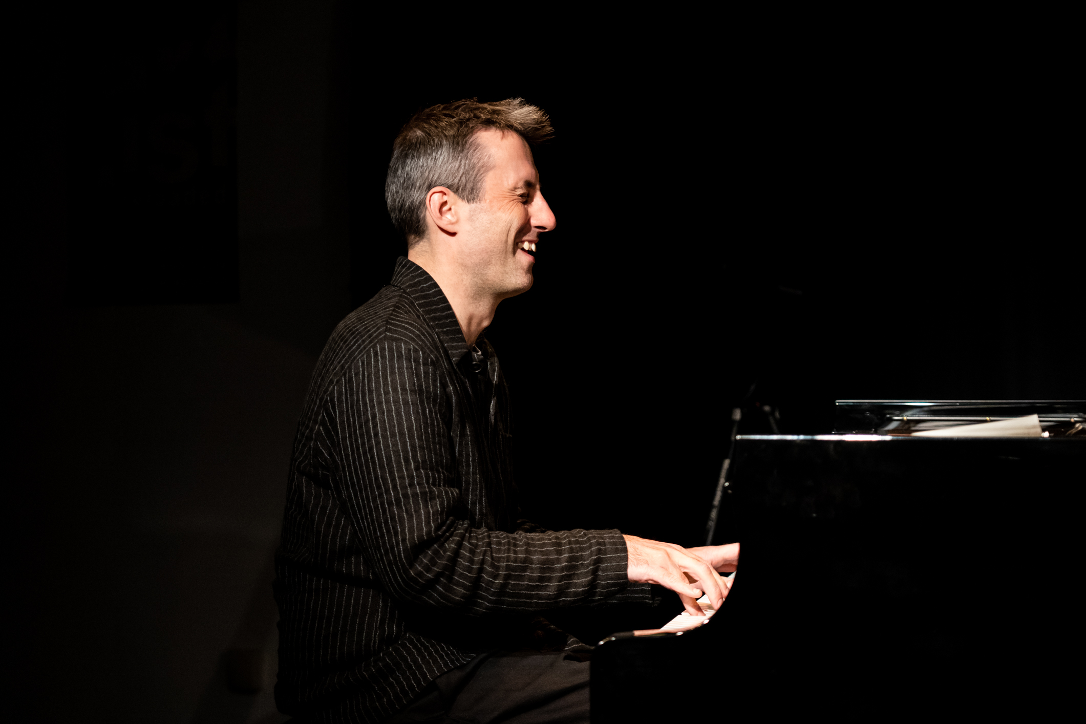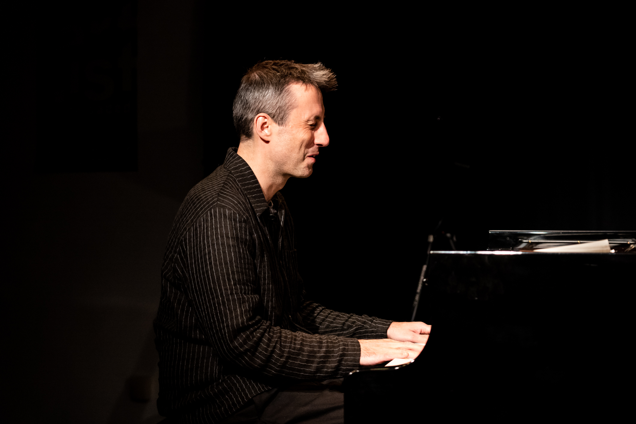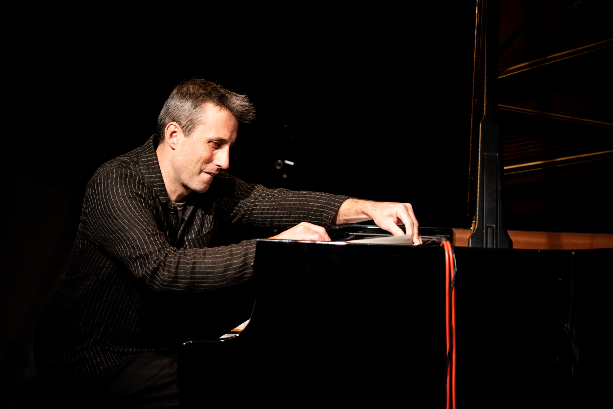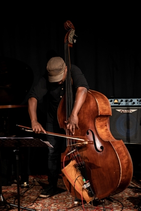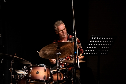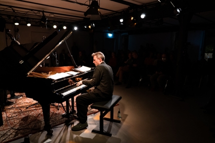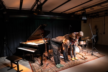Und was für ein Ort das ist! Und was für Musik hier gemacht wird! Und wie fantastisch sie in ihrer neuen Heimat klingt! Der Engländer Alexander Hawkins war zum Eröffnungsabend mit seinem Trio gekommen und feuerte erst einmal eine ungeheure perkussive Energie in den vollbesetzten Konzertraum, als wolle er dessen Akustik testen (und den neuen Steinway gleich mit), während Steven Davis am Schlagzeug diese Energie aufnahm und in unendliche Einzelteile aufbrach und aus den Fasern neue musikalische Gedanken spann.
