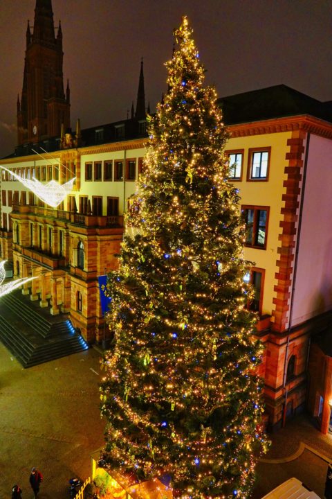 Dürfen wir vorstellen, der Wiesbadener Weihnachtsbaum 2020. Offiziell zur Verzauberung freigegeben wird er heute um 17 Uhr, hier könnt ihr ihn schon mal in voller Pracht bewundern – 25 Meter Nordmanntanne, geschmückt mit 30.000 LED-Blitzlichtern und 250 goldenen Schleifen. Wie gefällt er euch? Was vielen ganz und gar nicht gefällt, ist natürlich die pandemiebedingte Absage des Sternschnuppenmarkts in diesem Jahr. Die Stadt und weitere Akteure bemühen sich, trotz allem vorweihnachtliche Atmosphäre in der Wiesbadener Innenstadt zu schaffen.