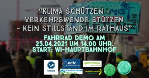 Unter dem Motto „Klima schützen, Verkehrswende stützen – Kein Stillstand im Rathaus!“ rufen der Fahrradclub ADFC und weitere Vereinigungen für den 25. April 2021 zu einer Fahrraddemo auf. Unter dem Motto „Klima schützen, Verkehrswende stützen – Kein Stillstand im Rathaus!“ treffen sich die Mitradelnden um 14 Uhr vor dem Hauptbahnhof. Die Demonstration ist ein Appell an die nun politisch Verantwortlichen, die in der letzten Legislaturperiode begonnene Verkehrswende für Wiesbaden konsequent fortzusetzen. Die neue Stadtverordnetenversammlung kommt zur konstituierenden Sitzung am 29. April zusammen.