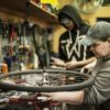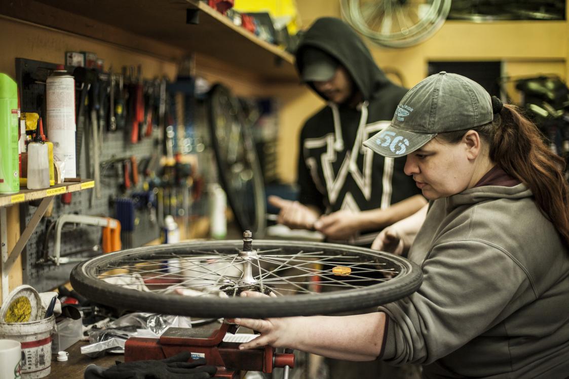 Susanne zum Beispiel, derzeit die einzige Frau. Die 36-Jährige hat früher im Büro gearbeitet, aber ohne eine richtige Ausbildung. Als dann noch gesundheitliche Probleme dazukamen, war sie lange arbeitslos. Bei den BauHaus-Werkstätten, deren Kernkompetenz die Beschäftigungsförderung unter erschwerten Bedingungen ist, konnte sie in unterschiedliche Arbeitsfelder hineinschnuppern. Und blieb beim „Radler“ hängen. „Ich bin sowieso eine leidenschaftliche Schrauberin“, sagt Susanne. „Und hier ist ein echt tolles Team. Die Arbeit macht Spaß.“ Sie hofft, die Ausbildung dann auch regulär machen zu können – bis jetzt ist es ein Ein-Euro-Job. Es gibt unterschiedlichste Finanzierungstöpfe, aus denen die Belegschaft ihren Lohn erhält. Neid ist dem Team fremd. Und zusammengehalten werden sie durch ihre „Fachanleiter“, ausgebildete Techniker mit pädagogischer Zusatzqualifikation: Sven Geyer, ein KFZ-Meister, ehemaliger Opelaner, und Marius Bachofen, Zweiradmechatroniker.