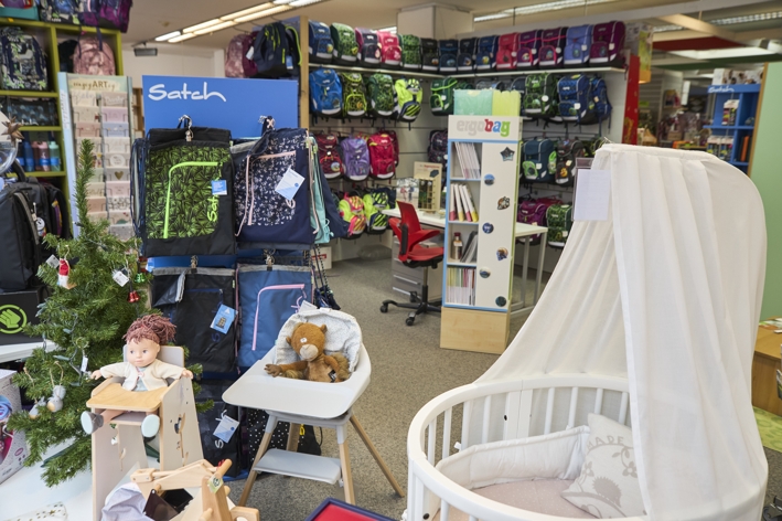 Riemenschneider legt dabei auch immer Wert auf europäische Fertigung. Doch es sind nicht nur Möbel, die man hier finden kann. Eine Riesenauswahl an Schulranzen steht bereit – in den aktuellen Trenddesigns, die Kinder gerade mögen. Aber auch als individuelle Künstlerstücke gibt es hier Ranzen: „Regelmäßig kommen Künstler zu uns, die die Rucksäcke nach Wunsch der Kinder besprühen. Dafür kommen Kunden aus ganz Deutschland“, berichtet Riemenschneider. Erwachsene finden ergonomische Rucksäcke in neutraleren Farben, auch mit reflektierenden Oberflächen gibt es Modelle. Und eine sehr ausgewählte Spielzeugabteilung lädt gerade zu Weihnachten zum Stöbern ein: Hier führt Riemenschneider zum Beispiel Holzspielzeug wie eine große, wunderschöne Arche mit Tieren.