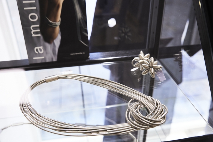 Wer dazu noch Schuhe braucht, findet die Sneakers der Schweizer Firma „on“, die mit einer ganz speziellen Sohle „Laufen wie auf Wolken“ versprechen und überdies sehr schick aussehen. Schmuckstücke aus Italien von „La Mollla“ – absichtlich mit drei L geschrieben – bestehen aus silbrigen Industriefedern, die sich an Hals und Arm der Trägerin schmiegen und den puristischen Look der Yukai-Kollektion sehr schön ergänzen.