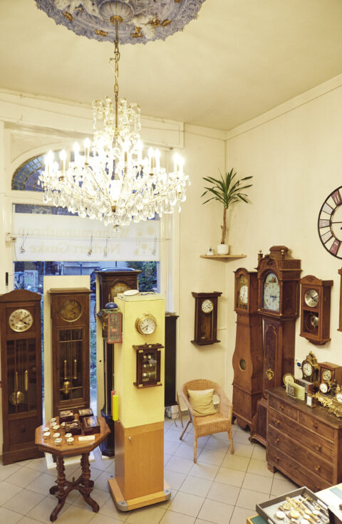 In der Hauptsache verkauft und repariert er aber in seinem Laden namens „Zeit & Klang“ im hübschen Ecklädchen am Sedanplatz Uhren. Riesige Standuhren, die schon den Status eines Möbelstücks einnehmen, aber auch Armbanduhren. Er hat sein Handwerk von der Pike auf gelernt. Den Laden hat er seit 2001. Im Verkaufsraum gibt es Stuck an der Decke, ein opulenter Kronleuchter hängt dort, und die Glasscheiben sind bunt verziert.