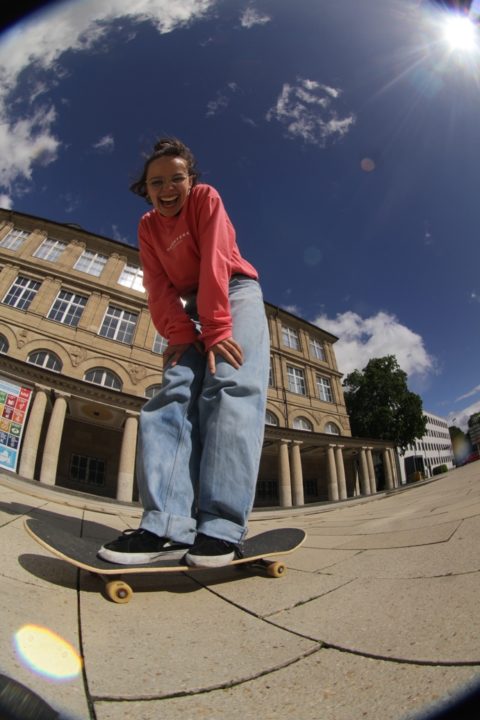 Was bedeutet ihr persönlich das Skateboarden? „Die Kreativität macht mir besonders Spaß. Einerseits das auf dem Brett stehen, den Asphalt spüren, das Kribbeln in den Fußsohlen. Und was du alles machen kannst: sein eigenes Set-up herstellen. Du merkst ziemlich schnell, was zu dir passt.“ Außerdem könne man sich künstlerisch ausleben – und das überall: „Egal in welcher Stadt du bist, du hast durch das Skateboarden immer eine Connection. Du hast den gleichen Lifestyle und hats direkt eine Vertrauensbasis.“ Skateboarden bedeutet auch viel Freiheit für sie: „Mittlerweile komme ich über jede Bordsteinkante, und das macht so einen Spaß. Darum geht es letztlich überall, Hindernisse zu überwinden.