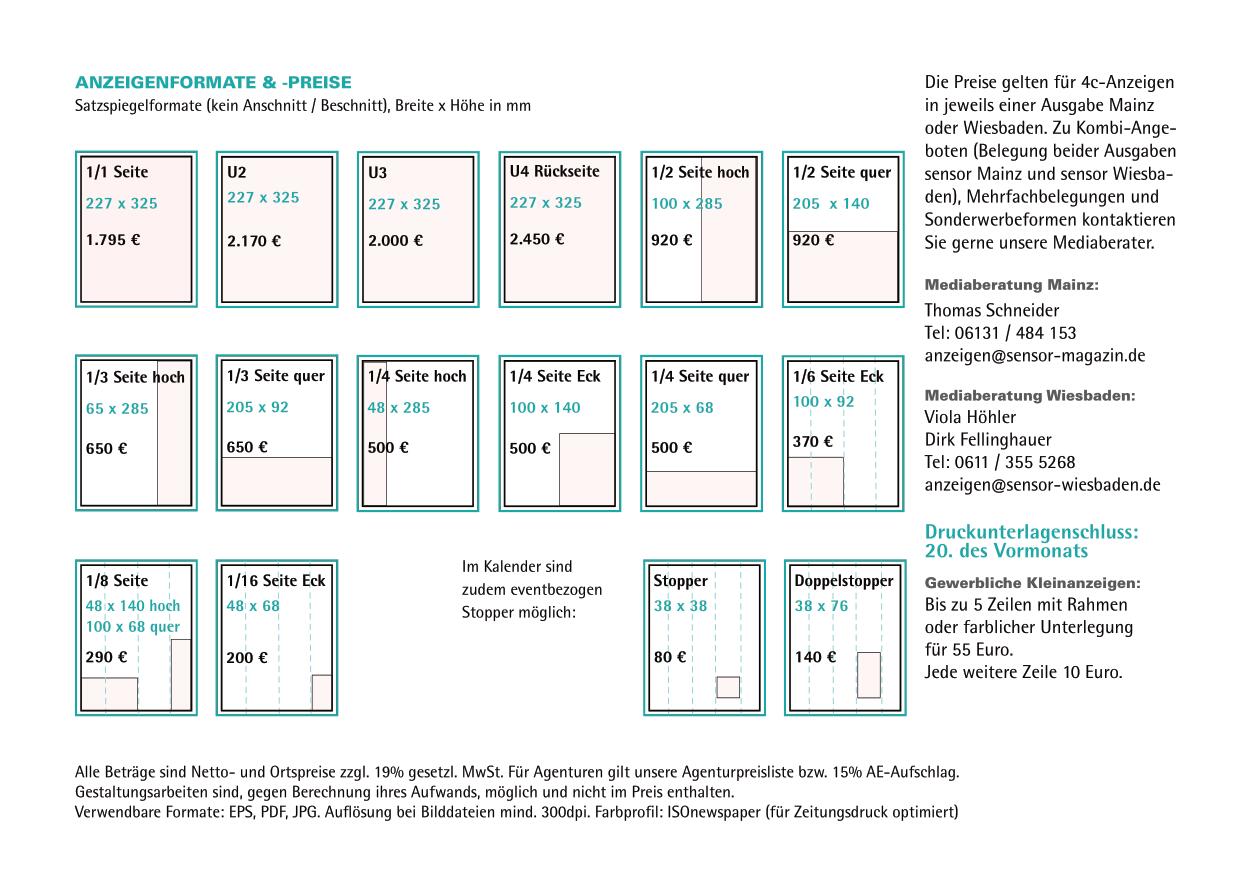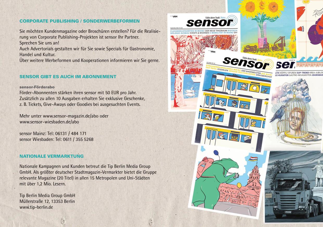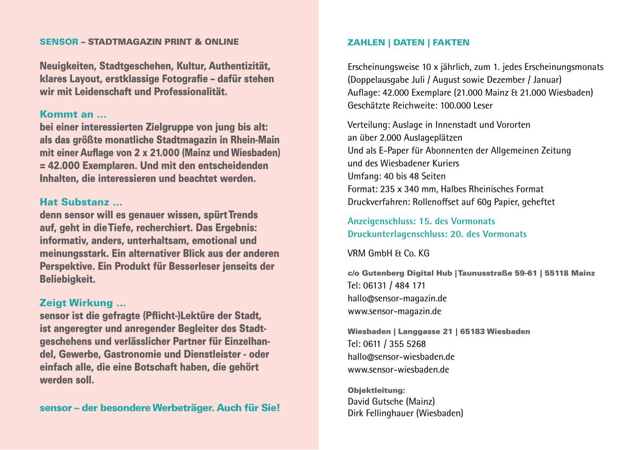 Unser Printmagazin (www.sensor-wiesbaden.de/ausgaben) ist und bleibt das Herzstück im stetig weiter wachsenden sensor-Kosmos, auch für Werbung und Mediaplanung. Neben klassischen Anzeigen gibt es auch Sonderwerbeformen wie – einfach, günstig, wirkungsvoll – den „Wir sind da“-Gastro- und Einzelhandel-Guide oder auch Advertorials und Sonderveröffentlichungen. Attraktiv und zielführend sind auch Onlinewerbung- und Social Media-Kampagnen.