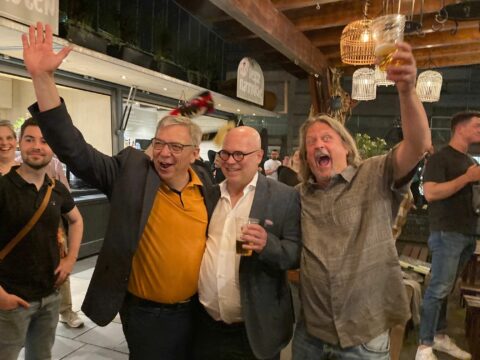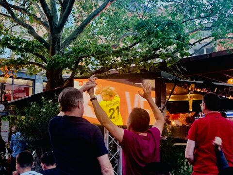 Die Aufstiegspartie wurde in Wiesbaden in diversen Bars und Kneipen übertragen. Ein städtisch organisiertes Public Viewing gab es nicht, aber auf dem Sommermarkt auf dem Mauritiusplatz wurde kurzfristig ein Public Viewing mit LED-Leinwand realisiert. Einige Hundert Fans verfolgten das Spiel hier in bester Stimmung und feierten den Aufstieg. in der Menge fieberten und feierten auch Oberbürgermeister Gert-Uwe Mende (Foto links), Landtagspräsidentin Astrid Wallmann und Lokalpolitiker:innen diverser Parteien.