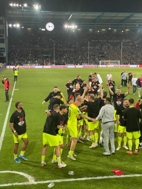 Nach dem Schlusspfiff wurde am Dienstagabend direkt auf dem Rasen losgefeiert, bevor es im Bus zurück nach Wiesbaden ging. Dieser steuerte dann am frühen Morgen Das Wohnzimmer in der Schwalbacher Straße an, wo die Aufsteiger erwartet wurden.