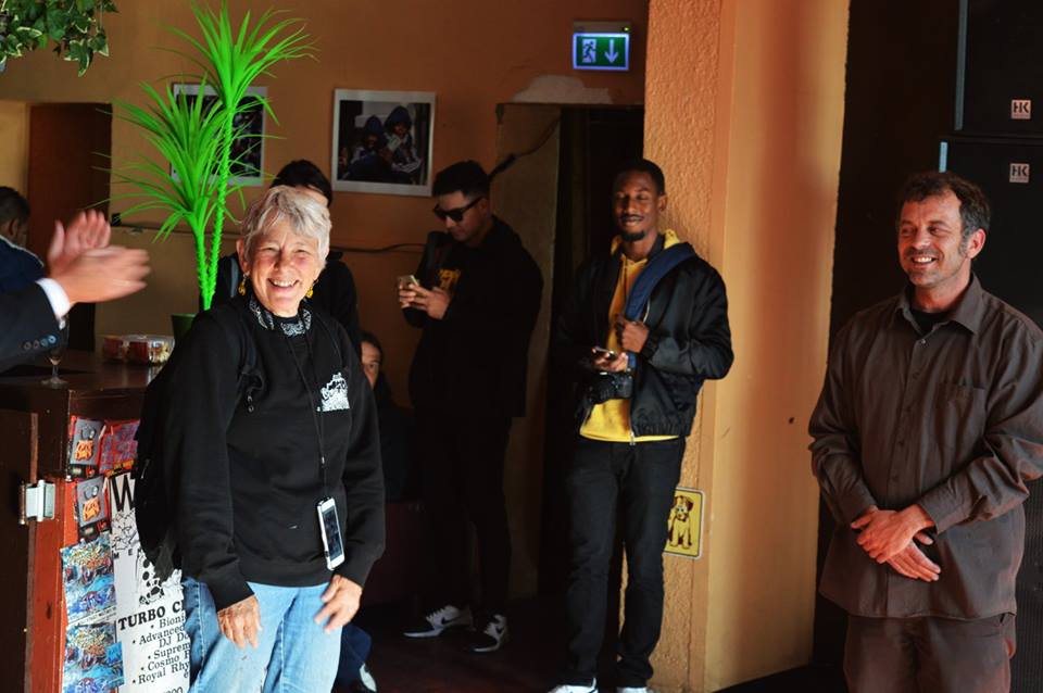 Manuel Gerullis (hier mit HipHop-Fotografie-Ikone Martha Cooper im Kontext) als Inititator der Veranstaltung, der Aktion Farbenfroh und von Kontext e.V. ist verantwortlich für die organisatorische und künstlerische Betreuung und koordiniert die weltweiten Events. Stefan Ölke als Vertreter des Jugendzentrums Reduit, ist verantwortlich für Infrastruktur und Logisitk sowie die Kommunikation mit städtischen Institutionen. Das Jugendzentrum Reduit: als jugendkultureller Veranstaltungsort etabliert, verfügt das Team des JuZ über jahrelange Erfahrung in der Durchführung von grossen und kleinen Events . Weiter nehmen rund 20 Personen ehrenamtlich an der Durchführung des Events teil. (dif)