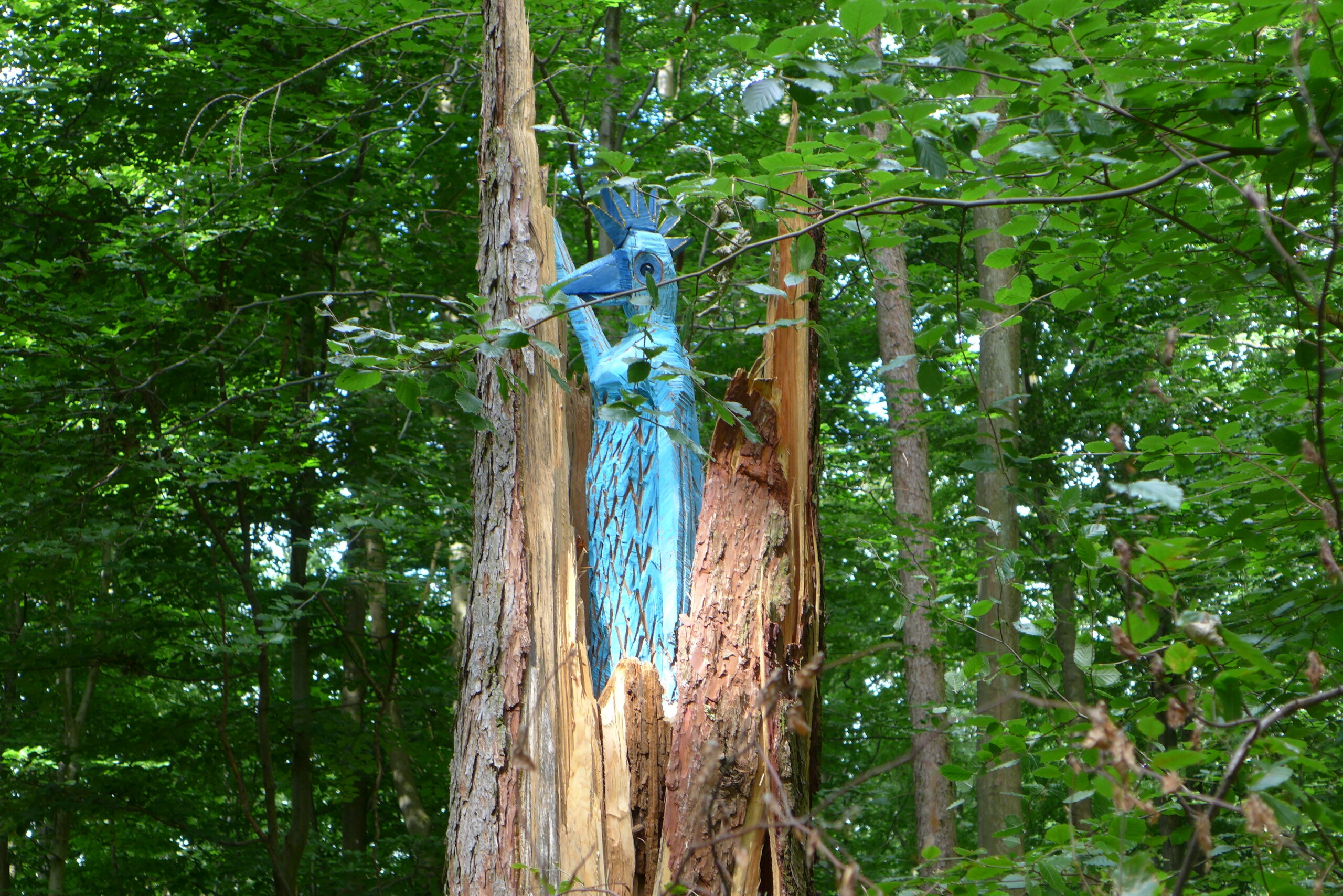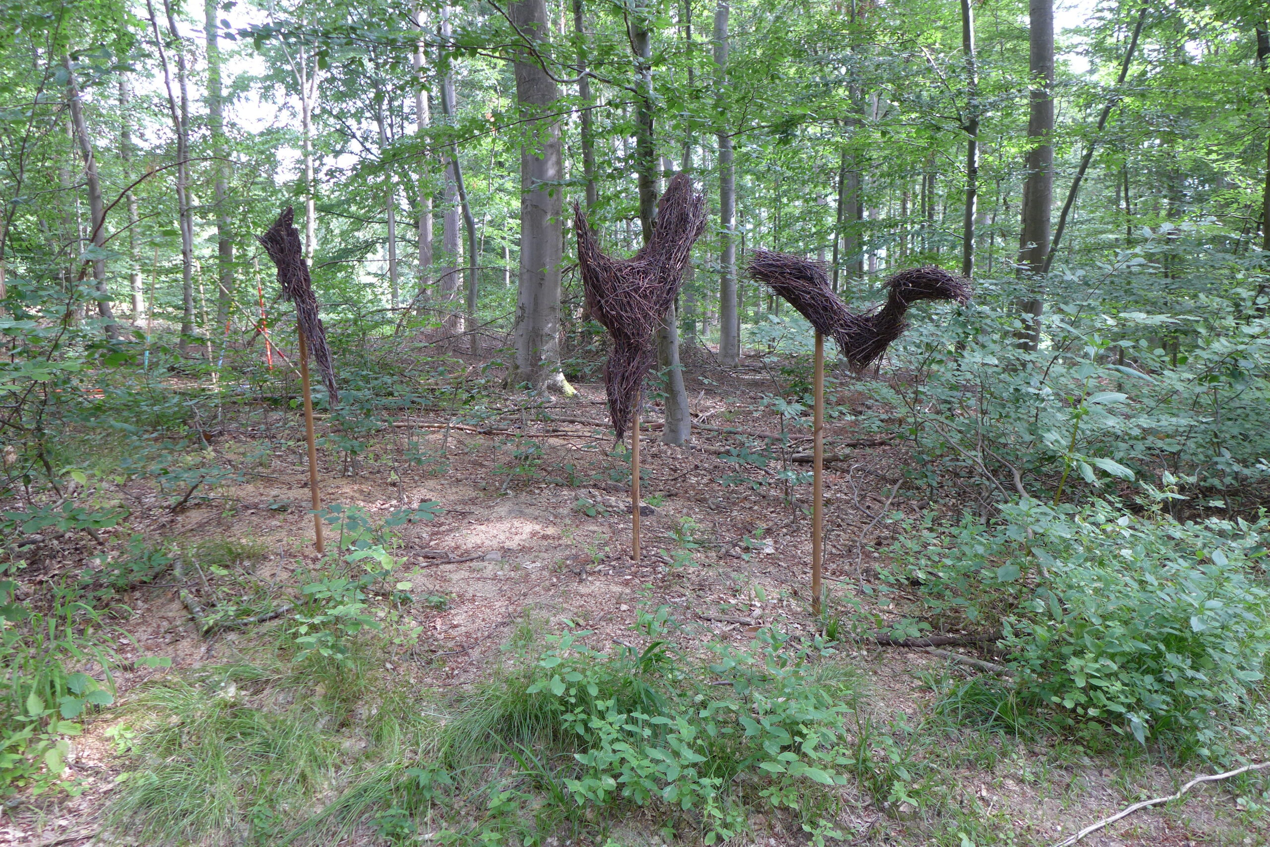 Im Gegensatz dazu steht Klaus Seibolds „Fern-Seher“, ein Rahmen auf Stelzen im Bildschirmformat, der einen Ausschnitt einer Lichtung ins Bild rückt. Usch Quednaus leuchtend blaue „Waldkönigin“ schaut als gekrönte Vogelfigur aus einem geborstenen Baum hervor und soll, so ihre Schöpferin, den Wald beschützen und Hoffnung symbolisieren. Doris Bardong stellt Figuren aus Ästen geformt auf Stelen und regt die Phantasie des Betrachters an: Sind es Buchstaben oder Tierfiguren?