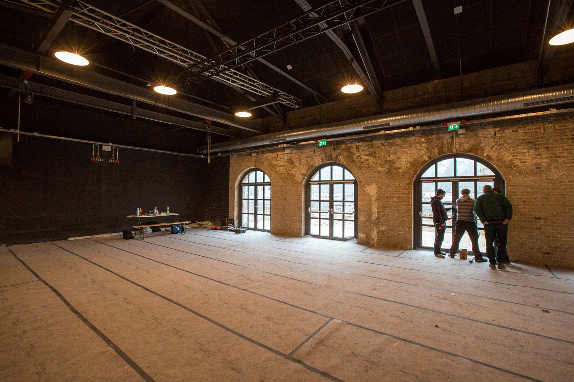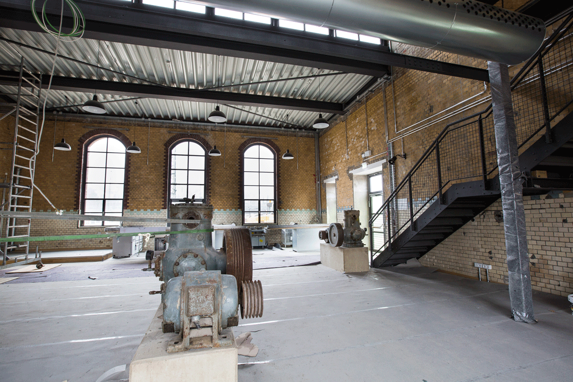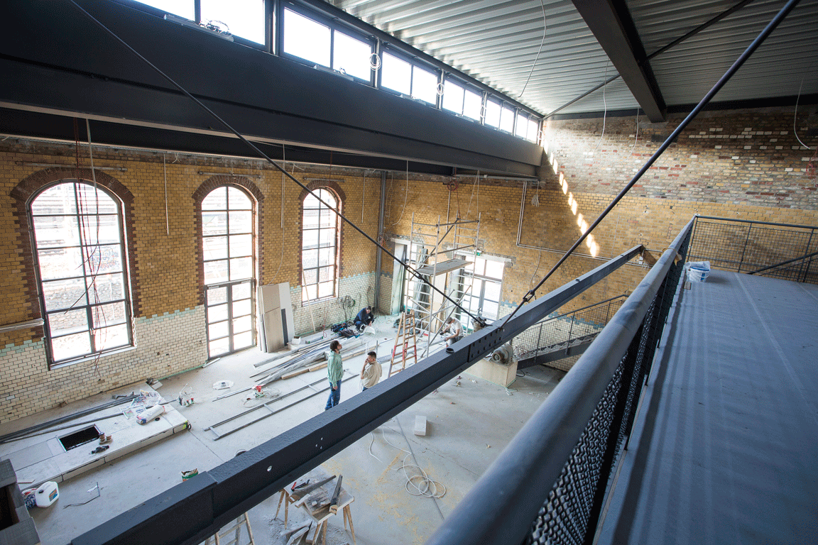 Musste man bislang vom Eingang der neuen Halle um den halben Schlachthof herum gehen, um zur Räucherkammer zu gelangen, liegen sich die Pforten zu den Veranstaltungsräumen in Zukunft gegenüber. „Dadurch wird sich eine schöne Plaza bilden“, freut sich der zweite Vorsitzende des Schlachthofs, Carsten Schack. Während sich also das Kesselhaus in der Hälfte des Wasserturms befindet, die der neuen Halle zugewandt ist, zieht das 60/40 samt Biergarten auf die den Bahngleisen zugewandte Seite. Schöne Aussichten für Drinks mit Sonnenuntergang. Die frisch sanierten Backsteinmauern sind mit einer Fensterfront versehen worden, die mit dem Charakter des mehr als einhundert Jahre alten Industriebaus architektonisch bestens harmoniert. Ein Gestaltungsmerkmal, das sich auch im Inneren fortsetzt.