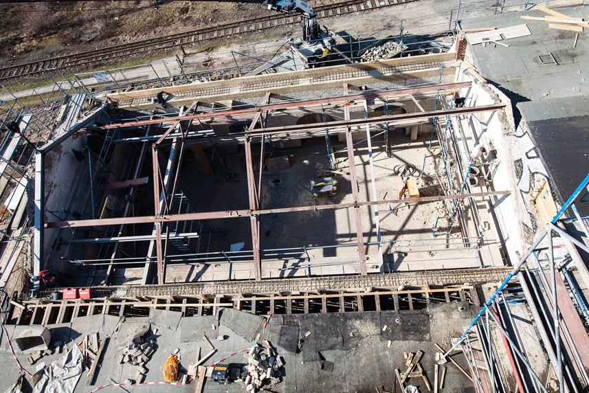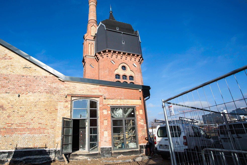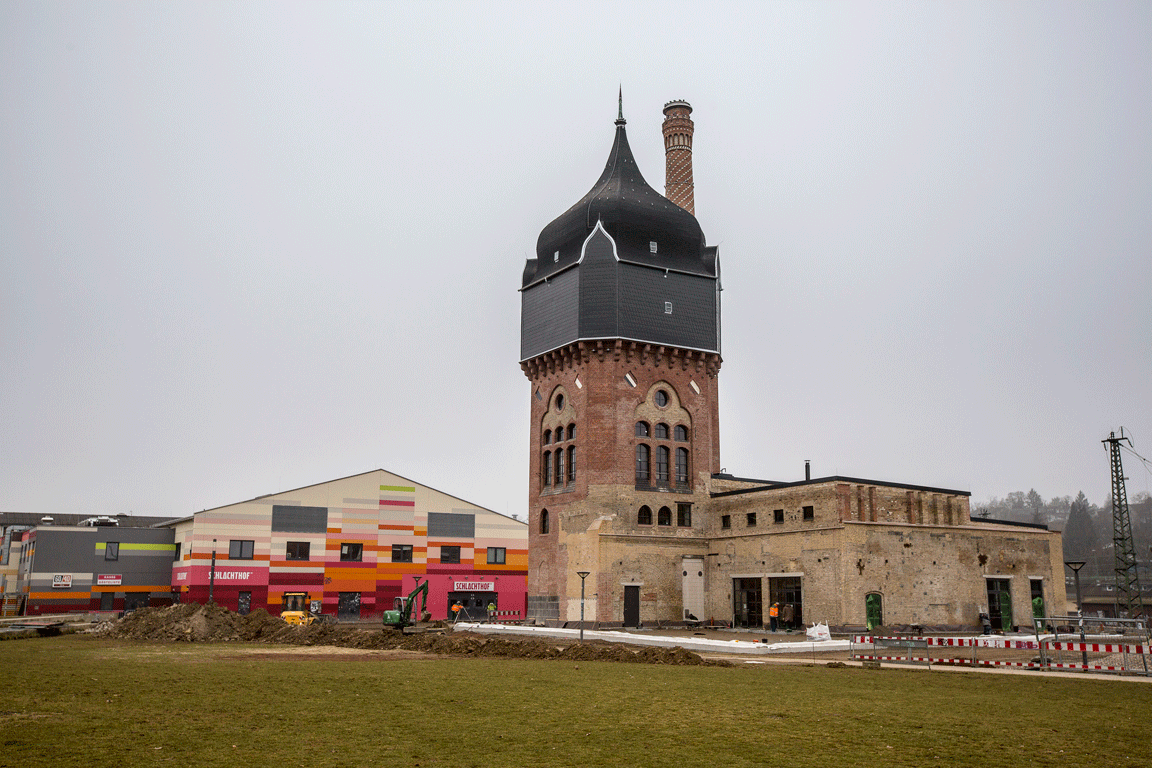Kurz vor Eröffnung des neuen Veranstaltungsraums Kesselhaus sowie des 60/40 geht es im alten Wasserturm am Schlachthof zu, wie in einem Ameisenhaufen. Überall sind Handwerker der verschiedensten Gewerke am Arbeiten, damit es mit dem Eröffnungswochenende Mitte März klappt. An einigen Stellen werden noch Fliesen gelegt, ein Presslufthammer beseitigt störende Elemente, bei der Elektrik wird das Feintuning vorgenommen, und auch das Außengelände bekommt langsam seine Form.