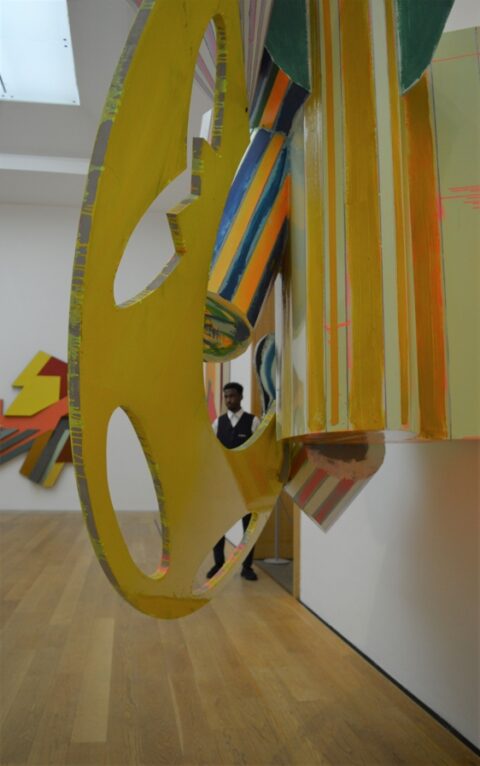 Serielles Arbeiten kennzeichnete auch von Anfang an das Schaffen Stellas, der 1936 in einem Vorort von Boston geboren wurde und in New York lebt und arbeitet – und, das zeigt der letzte Raum der Ausstellung, bis heute noch spannende neue Werke erschafft. Stellas Werk ist überaus vielschichtig, voller literarischer Bezüge und dabei weder abstrakt noch gegenständlich im herkömmlichen Sinne.