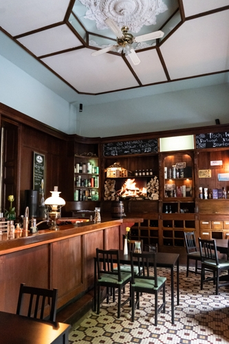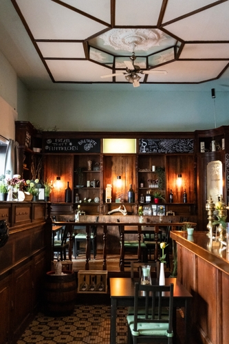 “Von beidem habe ich jeweils über 40 Sorten im offenen Ausschank”, erklärt der Gastgeber und weist damit auf sein Alleinstellungsmerkmal hin. Holzgetäfelte Wände, alte Apothekerschränke, ein sich fast einmal durch den Raum ziehender Tresen, verwinkelte Nischen auf unterschiedlichen Höhen, in den Regalen Whisky- und Weinflaschen aus aller Welt. Da hatte jemand ein gutes Händchen beim Interieur. Und nicht nur dafür: “Am Anfang kamen die Leute für den Wein”, erinnert sich Falch, “heute kommen viele für das Essen”.