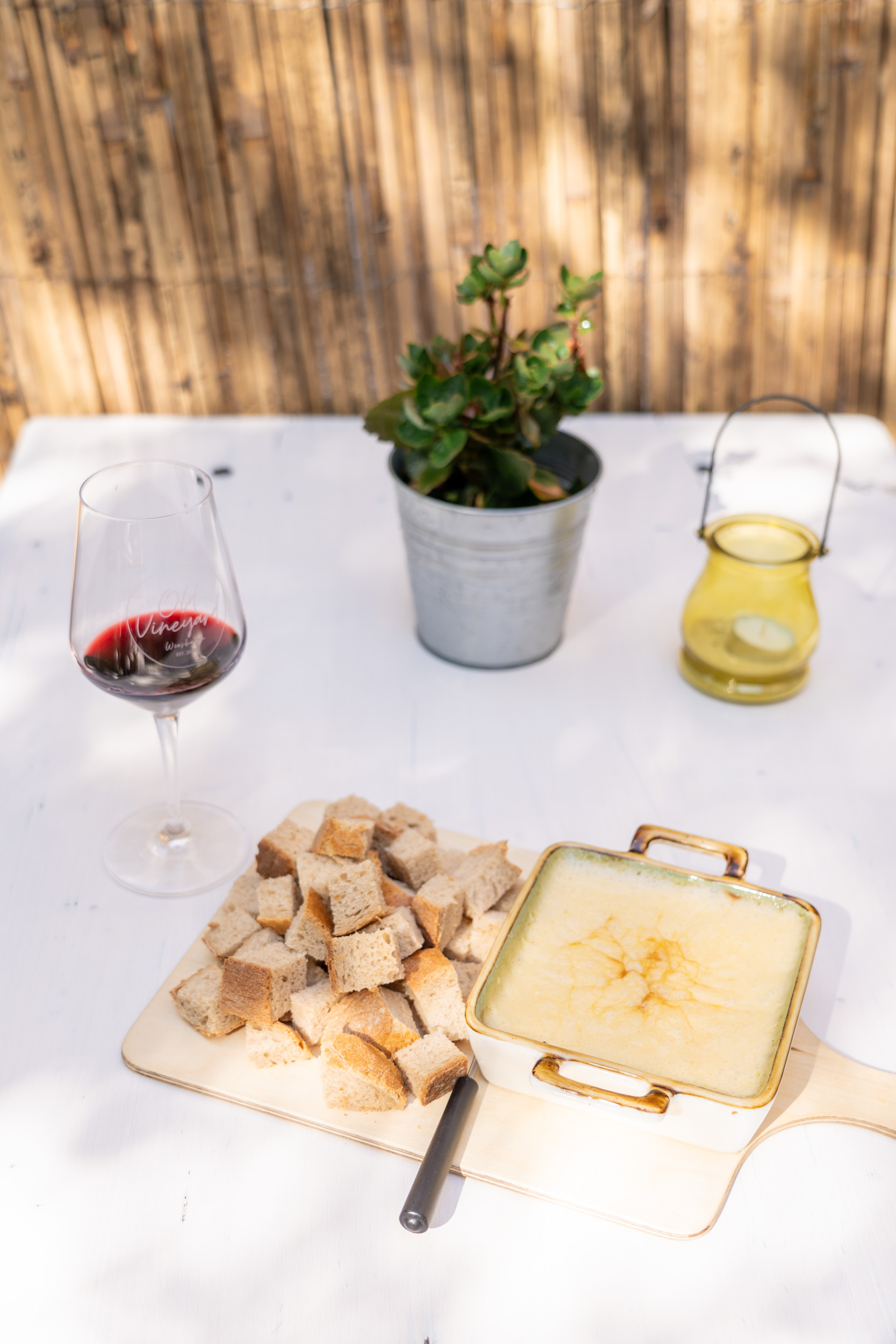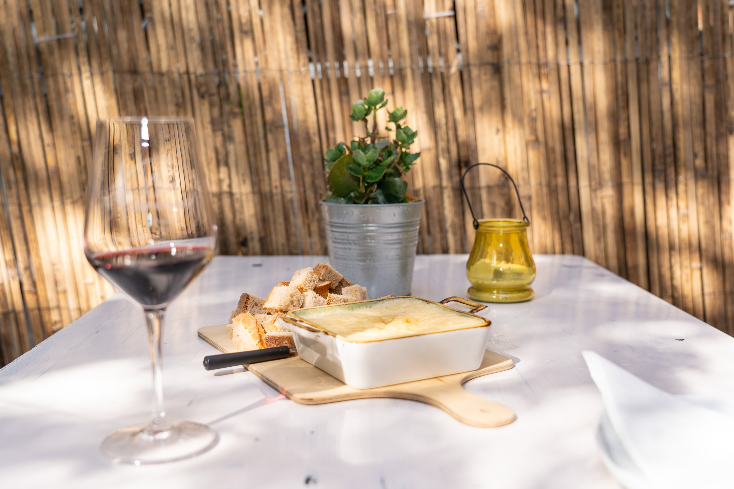 Hausgemachte Flammkuchen, überbackene deftige Ofenseelen, Bretarte (quasi eine Eigenkreation: die Symbiose aus Brezel und Flammkuchen – einfach selbst ausprobieren) und, für die etwas kühleren Monate, Fondue. Felchs Favorit auf der Karte sind die heiße Haus-Seele (mit Tomaten, gekochtem und rohem Schinken, “Spezialgewürz” und Edamer Käse überbacken) sowie der warme Kochkäse. “Alles, was zum Wein passt und schmeckt”, beschreibt er sein Angebot und empfiehlt dazu einen roten Zlatan Plavac aus Kroatien.