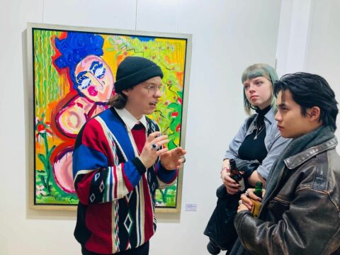 „Emotional Circus“ heißt die von dem 23-jährigen Nick Marschalek (hier bei der Vernissage im Gespräch mit interessierten Gästen) kuratierte aufregende Schau junger Kunst bei Kunst Schaefer in der Faulbrunnenstraße. Damit nicht genug: Zur „Kurzen Nacht“ präsentiert dort die Medienkünstlerin Laetitia Eskens mit eine speziell auf die Galerieräume angepassten Videoinstallation.