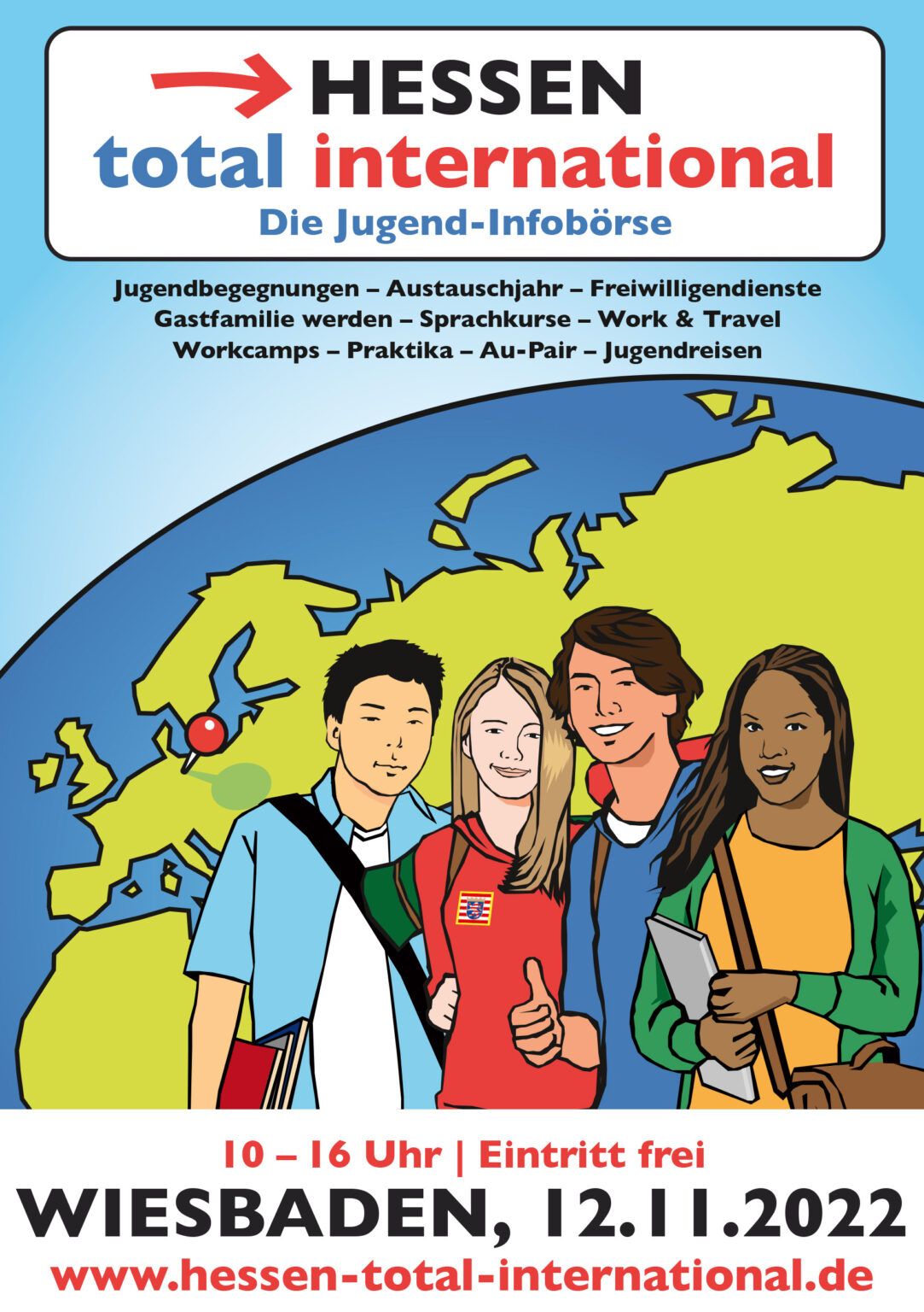 JuBi – Die JugendBildungsmesse im Rathaus Wiesbaden. Austauschorganisationen, Veranstaltende und Agenturen aus dem gesamten Bundesgebiet informieren auf der JuBi-Tour über alle Facetten von Auslandsaufenthalten und stellen ihre Programme und Stipendienangebote vor. Die Beratung zu Themen wie Schüleraustausch, High School-Aufenthalte, Sprachreisen, Au-Pair, Work & Travel, Freiwilligendienste sowie Praktika im Ausland erfolgt persönlich an den Ständen der Aussteller:innen durch Bildungsexpert:innen und ehemalige Programmteilnehmer:innen. Von 10 bis 16 Uhr.