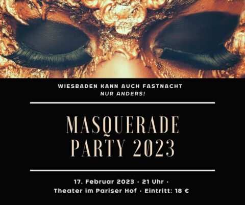 sensor präsentiert: “Masquerade Party 2023” im Theater im Pariser Hof. Wiesbaden kann Fastnacht – nur anders: Unter dem Motto „Masquerade Party“– dress 2 impress, von Glitzer & Glammer über Perücken, Masken und was Spaß macht. DJ Dee, Moderator bei Radio Rheinwelle und seit 30 Jahren an den Reglern, lässt an diesem Abend keine Wünsche nach Bewegung offen. Wer Faschingsmusik erwartet, ist leider auf der falschen Rhein-Seite. Ab 21 Uhr.