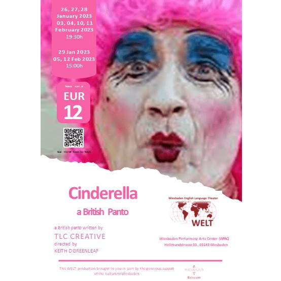 “Cinderella – a British Panto” im Wiesbaden Performing Arts Center. Cinderella lives a life of drudgery, bullied by her horrible Ugly sisters, Salmonella and Listeria. Her muddled and confused father, Baron Hardup is powerless to intervene and her only comfort is her pal Buttons! Prince Charming is holding a ball to meet his bride to be. Can this be the chance that Cinders has been waiting for? Freitag und samstags um 19.30 Uhr, sonntags um 15 Uhr.