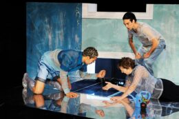 „blau“ im Staatstheater. Eine kleine Pflanze steht auf der Bühne und sie scheint sichtbar Durst zu haben. Also begeben sich die Schauspielerin Sophie und die beiden Tänzer Adam und Patric auf die Suche nach dem faszinierenden Nass. Auf dieser Reise führen sie ihr junges Publikum durch verzaubernde Klang- und Bildwelten. Eine Produktion die nicht nur die ganz Kleinen verzaubert. Um 10 Uhr.