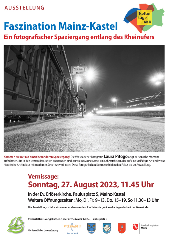 Fotografien in der Evangelischen Erlösergemeinde. Im Rahmen der Kulturtage AKK stellt Laura Pitogo ihre Fotografien über das Kasteler Rheinufer in der Evangelischen Erlösergemeinde in Mainz-Kastel aus. Zu dieser Vernissage sind alle ganz herzlich eingeladen. Um 11:45 Uhr. Das volle tolle AKK Kulturtage Programm hier.