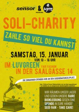 Luvgreen und sensor laden zum Soli-Charity-Shopping quer durch die (Ex-)Kollektionen des „Fair Fashion & Accessoires“-Ladens an diesem Samstag, 15. Januar, von 10 bis 16 Uhr im Geschäft in der Saalgasse 14. Es gelten die aktuellen 2G-Regeln.