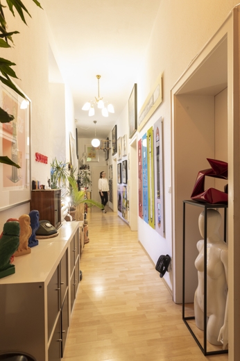 Anders als die traditionellen Wiesbadener Galerien befindet sich jene von Daniela Weinstock und Thorsten Frerk direkt in deren am Dürerplatz gelegener Privatwohnung. Einmal eingetreten, fühlt man sich wie in einer anderen Welt: Da finden sich Unmengen an Bildern an den Wänden, und Skulpturen werten die Ecken eines jeden Raums des 114-Quadratmeter-Domizils auf. Selbst profan wirkende Möbelstücke fügen sich in das Gesamtbild ein und verwandeln sich in kleine Kunstwerke. Oder zumindest kommt es Laien so vor. Typischer Anfängerfehler eben.
