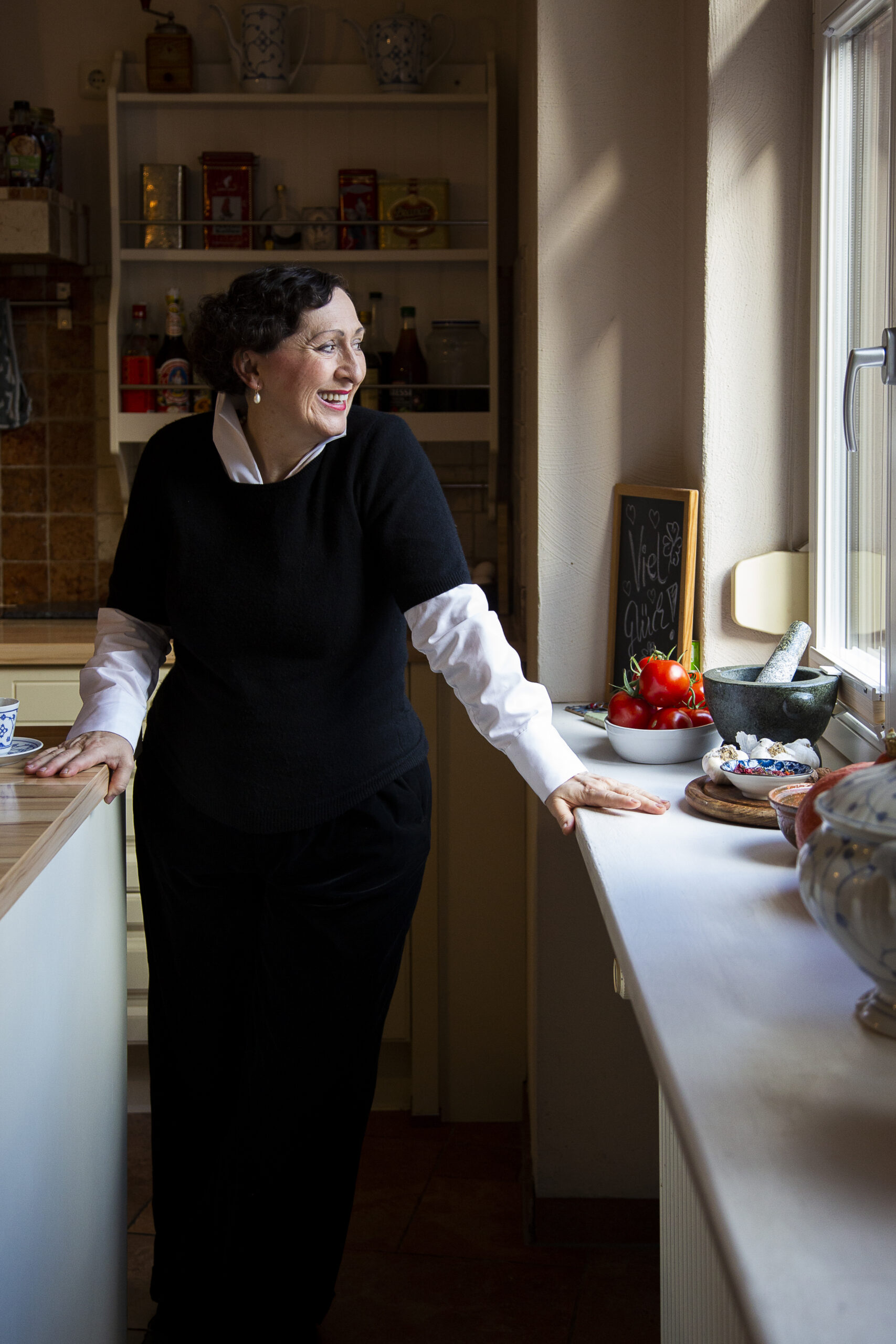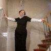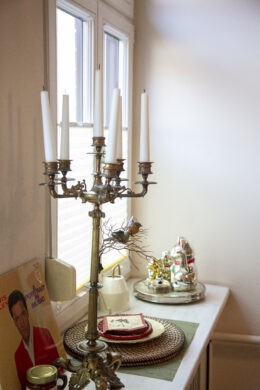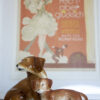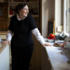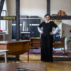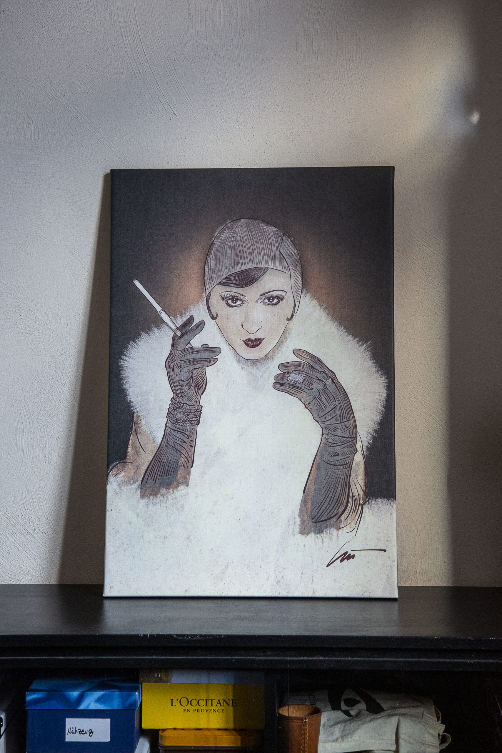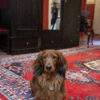 Das Haus bewohnt die Familie seit 2018, gebaut wurde es schon 1876. Es ist über einen gepflasterten Innenhof zu erreichen, wie üblich in dieser Gegend. Weiter geht durch ein dunkelrot gestrichenes Foyer, wo mich auch der junge wilde Familienhund Fritz recht herzlich empfängt. Nach der stürmischen Begrüßung habe ich Gelegenheit, mich umzuschauen. Außer Garderobe, Kommode und zwei kunstvollen Jugendstil-Stühlen hängen hier wunderschöne bunte Bühnenkostüme auf einer Stange, bereit zum Transport.