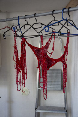 Auf einem kleinen Foto an der Wand sieht man eine Braut mit Kontrabass, das ist Evis Mutter auf ihrer Hochzeit. Sie sei als Mädchen die einzige Kontrabassistin gewesen, ihr Instrument ist inzwischen in die Produktion der „M&G Showcompany“ übergegangen und liegt, bereit für die nächste Show, in einer Kiste mit dem Firmenlogo in dem Lagerraum. Dort sind auch die anderen Instrumente, Lichtequipment und unzählige Kostümen aufbewahrt. Hier, in den rauen Lagerräumlichkeiten, schläft die Show. Der Weg führt durch den Waschraum, wo rote handgewaschene Pailletten-Tangas von den Kostümen trocknen. Pailletten vertragen keine Waschmaschine, so Niessner.