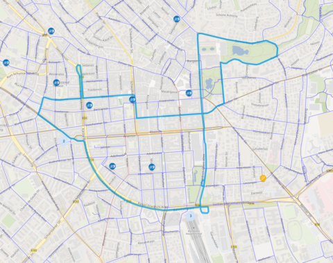 Radler*innen können bei der „Großen gemeinsamen Einzelfahrt“ auf einer Rundroute durch die Innenstadt mitfahren und an einem beliebigen Punkt einsteigen. Die Route, die vom Radbüro und dem ADFC zusammengestellt wurde, ist ca. acht Kilometer lang und führt entlang der neuen Radverkehrsanlagen, beispielsweise durch die Luisenstraße.