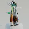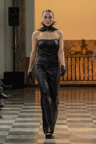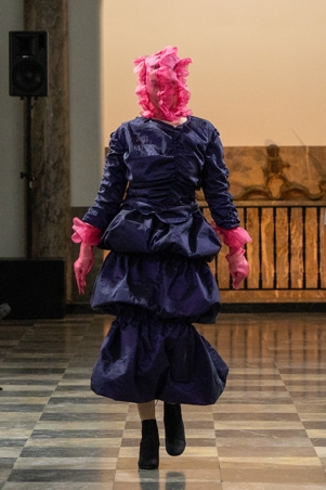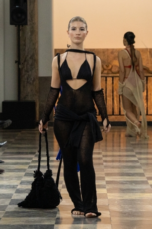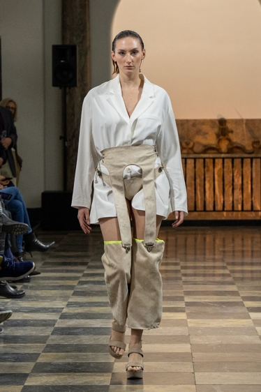 In der einzigartigen Kulisse der Wandelhalle präsentierten dort auch Nicolas Kraft und Nina Sterling ihre Kollektionen. Kraft hatte sich dafür mit einer Gesellschaft beschäftigt, deren Zivilisation durch den Klimawandel zerstört wird und die dadurch gezwungen ist, zum Nomadentum zurückzukehren. Seine Entwürfe verbinden ein klinisches, steriles Weiß mit praktisch-robusten Elementen. Kommilitonin Sterling machte das Element Wasser und den Umgang damit zum Thema ihrer Kollektion. Die Teile stellen die unterschiedlichen Aggregatszustände dar – von Eis über Flüssigkeit bis hin zu Dampf. Recherchiert und sich inspiriert hat die 22-Jährige auch in der Ausstellung „Alles im Fluss“, die noch bis 2024 im Landesmuseum zu sehen ist.