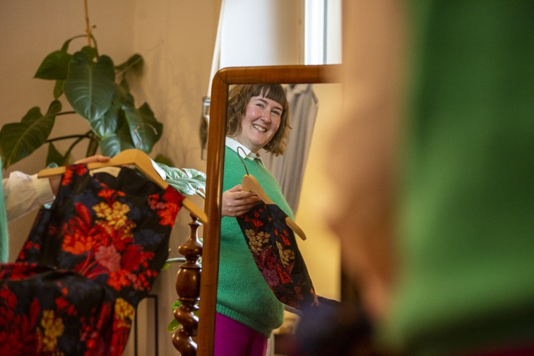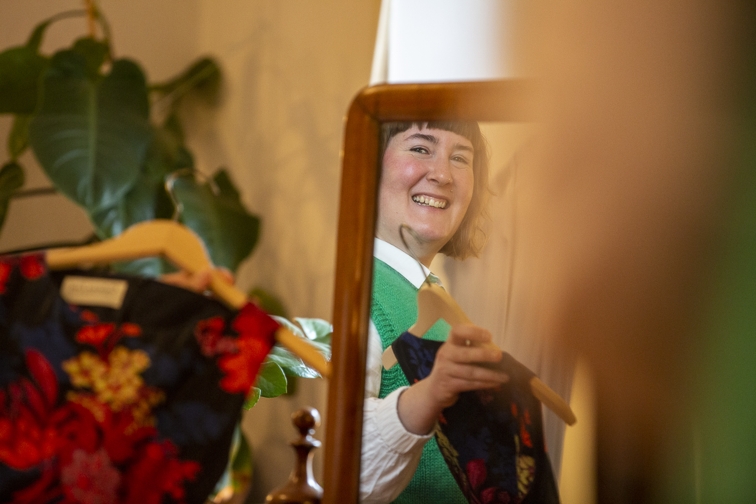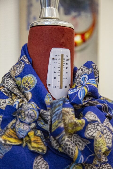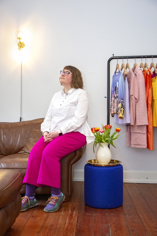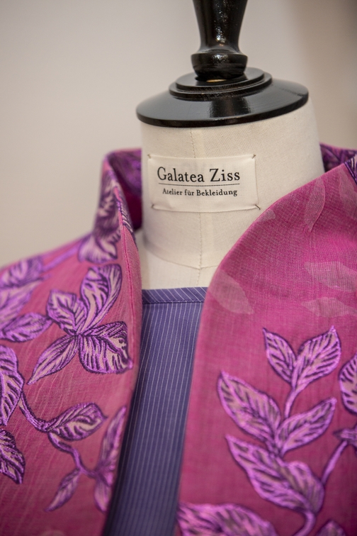 Nicht ganz so „couturig“, aber ebenso individuell ist die Mode von Galatea Ziss. Sie hatte bis 2021 ein prominent gelegenes Atelier am Kaiser-Friedrich-Ring. Als hier die Türen schlossen, hätte man durchaus denken können, dass „so etwas sich nicht hält“ – erst recht nicht in Corona-Zeiten. Aber das Gegenteil war der Fall. „Während Corona wollten viele Menschen lokales Handwerk und Einzelhändler unterstützen, das Geschäft lief eigentlich nicht schlecht“, so Ziss. Aber der Standort hatte viele Nachteile: zu einsehbar, zu laut, zu kalt. Jetzt sitzt Galatea Ziss mit ihrem Label in einer Altbauwohnung im Rheingauviertel und stellt – nach einer unfreiwilligen Auszeit durch einen Unfall – weiterhin Maßanfertigungen für größtenteils Damen her. Ihren Stil beschreibt sie als zeitgemäß mit klaren Linien, aber verspielten Details. „Ich mag Farben, Muster und Strukturen.“ Die meisten ihrer Kundinnen zwischen 30 und 60 tragen ihre Teile tagsüber, Abendroben und Anlassmode fertigt sie seltener an.