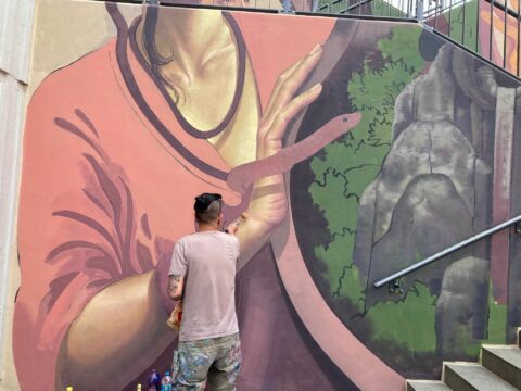 Ausführliche Fragen erbittet der Künstler schriftlich, nicht aus Arroganz, sondern aus Zeitnot. Bis Samstag muss er sein Freiluftwerk – es zeigt Sirona, die keltische Göttin der Heilung – vollenden. Als wir vorbeikommen, malt WD sogar weiter, während er isst – Farbrolle in der einen, Fischbrötchen in der anderen Hand. Er arbeitet in Eile, und doch in aller Ruhe, hochkonzentriert, er zaubert feine Details und hat das Ganze im Blick. Genau so sollten es künftig auch Betrachter:innen machen.