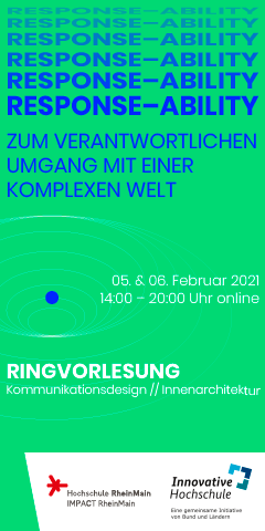 Die Ringvorlesung der Hochschule RheinMain setzt sich zum Ziel, einen Dialog mit Personen zu ermöglichen, deren Arbeit an diesen Fragen ausgerichtet ist. Response-ability ist Teil einer Reihe, die abwechselnd oder gemeinsam von den Studiengängen Kommunikationsdesign und Innenarchitektur veranstaltet wird. Die Veranstaltung ist auch offen für alle interessierten Bürger*innen. Die Reihe findet am 5. und 6. Februar online statt.